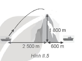 Một con tàu chiến ở bên này ngọn núi trên một hòn đảo, bắn một viên đạn với vận tốc ban đầu 250 m/s theo phương nghiêng góc 75° so với mặt nước biển tới đích là một con tàu khác nằm ở phía bên kia ngọn núi. Biết vị trí của hai con tàu và độ cao của ngọn núi được mô tả như Hình II.5. Hỏi viên đạn có qua được đỉnh núi không và có rơi trúng con tàu kia không?