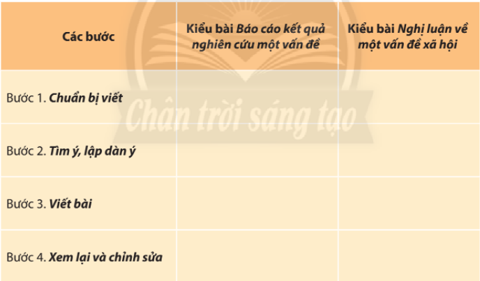 Nêu tóm tắt một số điểm khác biệt mà bạn cho là đáng lưu ý trong quy trình viết văn bản Nghị luận về một vấn đề xã hộiViết báo cáo kết quả nghiên cứu một vấn đề (có thể sử dụng mẫu bảng dưới đây và làm vào vở):