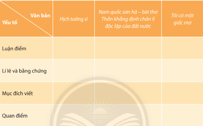 Xác định luận điểm, lí lẽ, bằng chứng, mục đích và quan điểm của người viết trong các văn bản nghị luận đã học dựa vào bảng sau (làm vào vở):
