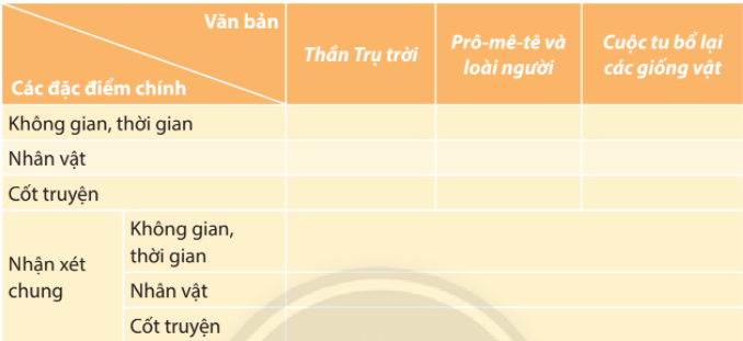 Bạn đã đọc hiểu các văn bản truyện thần thoại Thần Trụ trời, Prô-mê-tê và loài người, Cuộc tu bổ lại các giống vật. Hãy so sánh các văn bản và rút ra nhận xét chung bằng cách điền vào Phiếu học tập được kẻ vào vở theo mẫu sau: