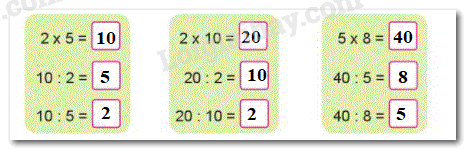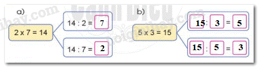 Ta lấy tích chia cho từng thừa số rồi viết phép chia phù hợp vào ô trống.