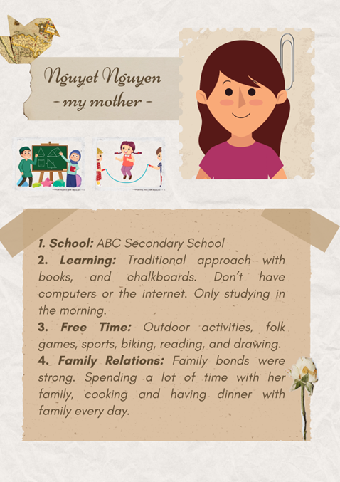 Mrs. Nguyet, my mother, attended ABC Secondary School, where the educational approach was traditional. Picture this: no computers, no internet—just books and chalkboards. She only went to school in the morning, learning is mostly dependent on textbooks and the guidance of their teachers.