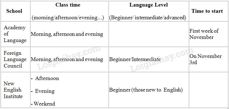 (Đọc ghi chú ông Lam đã viết. Sau đó xem các bài quảng cáo và chọn trường ngôn ngữ thích hợp cho ông ấy. Cho lí do cho sự chọn của em).