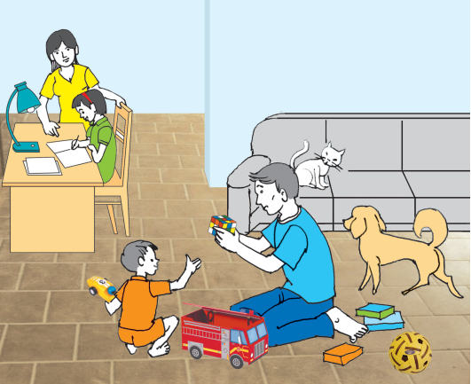 (Bố đang chơi với con trai và mẹ đang giúp con gái học bài.)