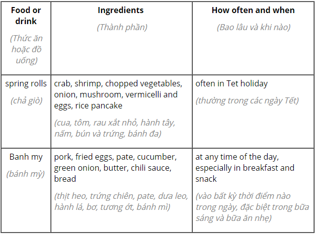 (Ghi chú về một loại đồ ăn hoặc thức uống phổ biến trong khu vực của bạn. Hãy nghĩ về các thành phần chính của nó, tần suất và thời điểm bạn dùng nó.)