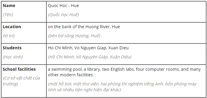 (Tên trường là Quốc Học – Huế. Trường nằm trên bờ sông Hương, ở Huế. Nhiều người nổi tiếng đã học ở đó như Hồ Chí Minh, Võ Nguyên Giáp, Xuân Diệu. Trường còn có cơ sở vật chất hiện đại như hồ bơi, thư viện, hai phòng thí nghiệm tiếng Anh, bốn phòng máy tính, và nhiều trang thiết bị hiện đại khác.)