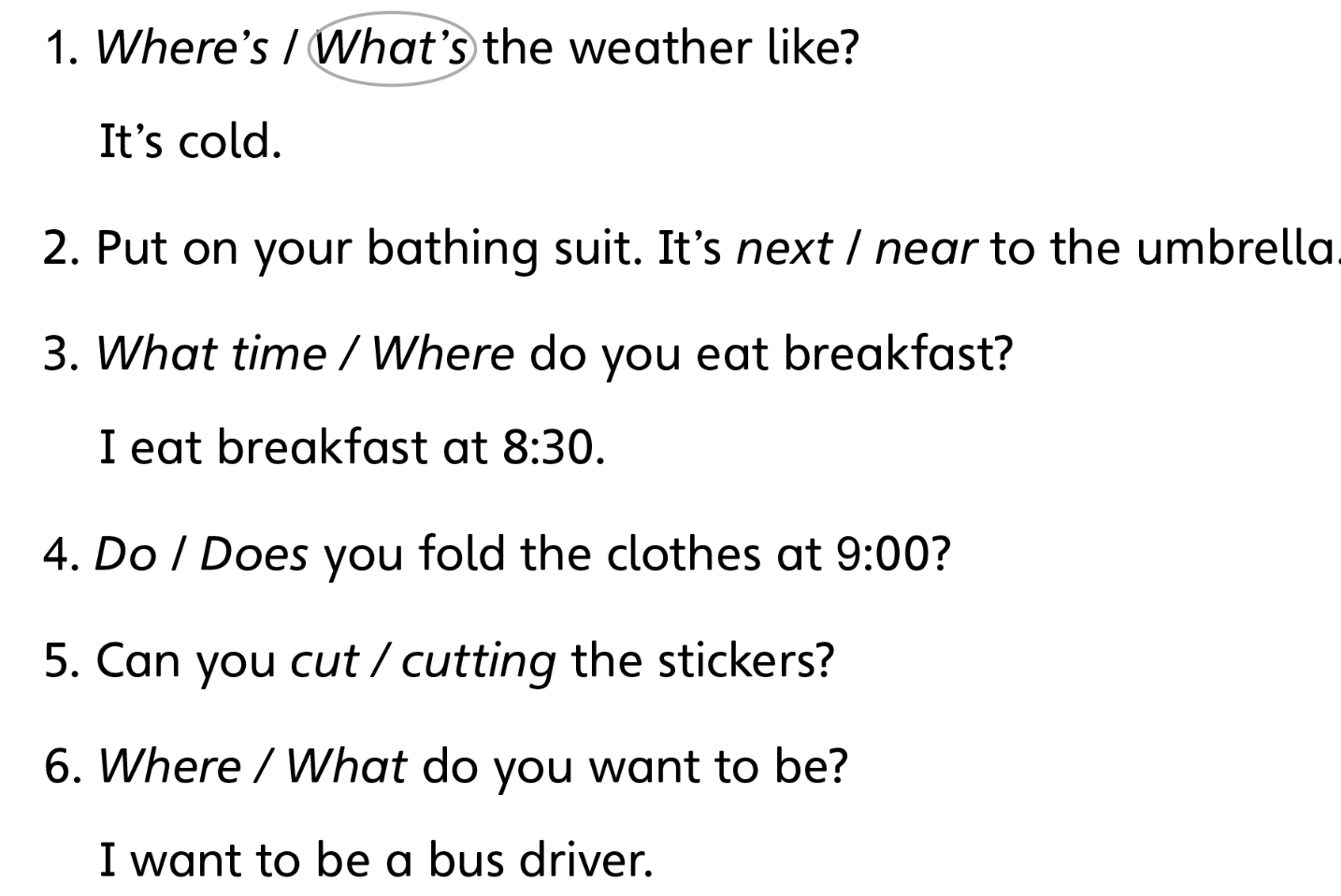 Read and circle. Reorder the sentences. Listen to the questions. Check the correct answers. Read. Answer the questions.