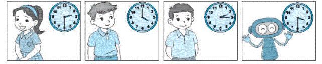 Quan sát đồng hồ để biết thời gian đến lớp của mỗi bạn và điền tiếp vào chỗ trống cho thích hợp.