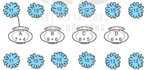 c) Lọ A nối với 2 bông hoa, lọ B nối với 3 bông hoa, lọ C nối với 4 bông hoa, lọ D nối với 3 bông hoa. Vậy ta tô màu đỏ vào lọ C, màu xanh vào lọ A.