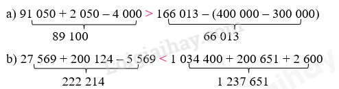 b) 27 569 + 200 124 – 5 569 ….. 1 034 400 + 200 651 + 2 600