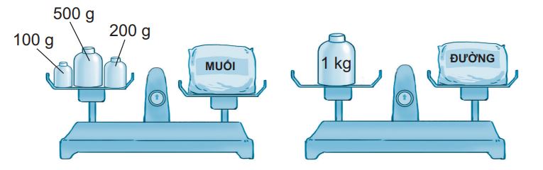 c) Túi đường và túi muối cân nặng tất cả 1 800 gam