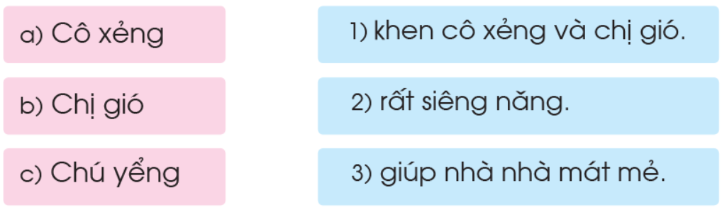 Cô xẻng làm việc rất siêng năng. Có lần, chị gió hăm hở dọn đỡ cô. Chả ngờ, gió làm rác văng khắp chốn. Chị gió buồn lắm.