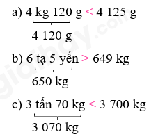 >, <, =? a) 4 kg 120 g ….. 4 125 g Con bò cân nặng 4 tạ 20 kg. Con trâu nặng hơn con bò 160 kg