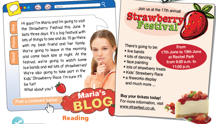 1. Look at the texts. How are they related? 2. Listen and read the blog entry. Match the phrases (1-3) to the phrase (a-c) to make correct sentences. 3. Answer the questions. 4. What would you like to do at the Strawberry Festival? Why? Tell your partner? 5. Listen and repeat. 6. Think of a festival in your country or in other countries. Use the phrases from Exercise 5 and your own ideas to talk about it. 7. Listen and complete the poster below. 8. You are planning to go to a festival. Write