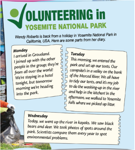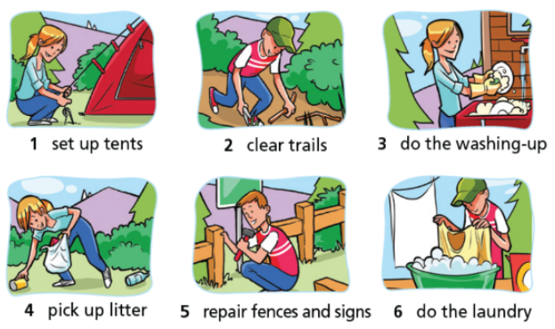1. Listen to the sounds. Where are you? What can you see? How do you feel? 2. What tasks can volunteers do when they visit Yosemite National Park? Listen and read to find out. 3. Read the text. For questions (1- 4), choose the correct answer (A, B or C). 4. What makes Wendy an eco- teen? Tell your partner. 5. Listen and repeat. 6. Which of volunteer tasks in Exercise 5 are chores?Choose the correct answer (A, B or C). 7. Listen to an announcement. For questions (1- 4), choose the correct answer