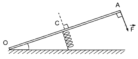Một bàn đạp có trọng lượng không đáng kể, có chiều dài OA = 20 cm, quay dễ dàng quanh trục O nằm ngang. Một lò xo gắn vào điểm giữa C. Người ta tác dụng lên bàn đạp tại điểm A một lực F vuông góc với bàn đạp và có độ lớn 20 N. Bàn đạp ở trạng thái cân bằng khi lò xo có phương vuông góc với OA và bị ngắn đi một đoạn 8 cm so với khi không bị nén. Lực của lò xo tác dụng lên bàn đạp và độ cứng của lò xo là