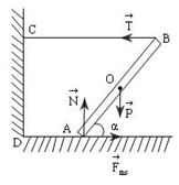 \(\begin{array}{l}P.\frac{{AB}}{2}{\rm{cos}}\alpha {\rm{ = T}}{\rm{.AB}}{\rm{.}}\sin \alpha \\ \to T = 0,5P.cot\alpha \end{array}\)