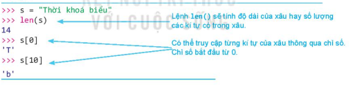 Lệnh trích ra từng kí tự của một xâu kí tự: thông qua chỉ số, bắt đầu từ 0 giống danh sách.