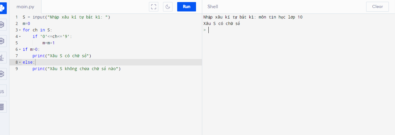 2. Viết chương trình kiểm tra xâu S có chữ số không. Thông báo “S có chứa chữ số” hoặc “S không chứa chữ số nào”