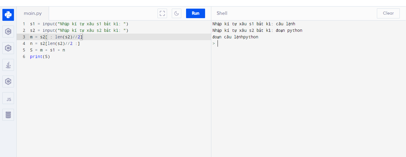 1. Cho hai xâu s1, s2. Viết đoạn chương trình chèn xâu s1 vào giữa s2, tại vị trí len(s2)//2. In kết quả ra màn hình.