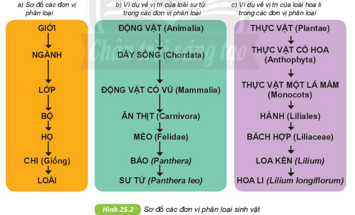 Các nhà khoa học đã phân loại sinh vật thành các đơn vị khác nhau: lớn nhất là giới → ngành → lớp → bộ → họ → chi (giống) → loài.