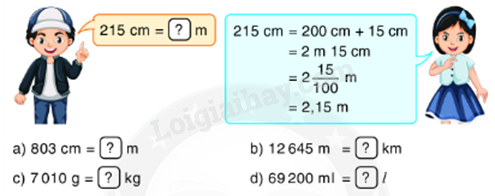 Dựa vào mối liên hệ giữa các đơn vị đo độ dài, khối lượng, dung tích để viết các số thập phân thành các số đo dưới dạng hỗn số thích hợp, sau đó viết số thích hợp.