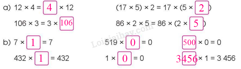 – Tính chất giao hoán: Khi thực hiện phép nhân hai số, ta có thể đổi chỗ các thừa chỗ mà tích không thay đổi.