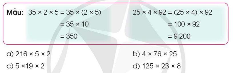 Áp dụng tính chất giao hoán và kết hợp của phép nhân để nhóm các số có tích là số tròn chục, tròn trăm, … lại với nhau.