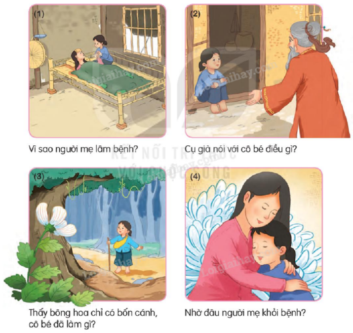 Một cụ già râu tóc bạc trắng đi qua. Sau khi nghe cô bé kể lại câu chuyện, cụ bảo cô hãy đi đến gốc cây cổ thụ đầu rừng, tìm bông hoa cúc màu trắng, có bốn cánh để làm thuốc cứu mẹ. Cô bé đi vào rừng, đến cây chỗ cụ già chỉ và thấy một bông cúc trắng. Cô hái bông hoa, nâng niu trên tay như là vật quý. Đột nhiên, cô bé lại nghe thấy tiếng cụ già văng vẳng dặn rằng: Bông hoa có bao nhiêu cánh thì mẹ của con sẽ sống được bấy nhiêu ngày.