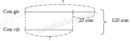 Bác Tư nuôi được tất cả 120 con gà và con vịt. Số gà nhiều hơn số vịt là 20 con. Hỏi bác Tư nuôi được bao nhiêu con gà, bao nhiêu con vịt?