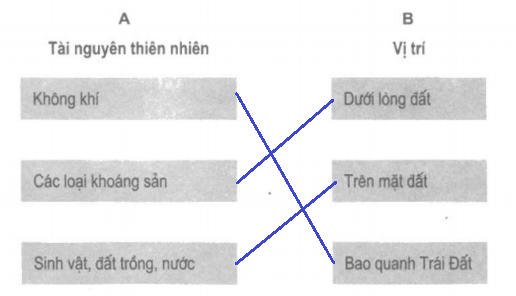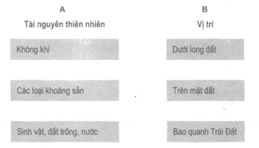 Nối tên tài nguyên thiên nhiên ở cột A với vị trí của tài nguyên đó ở cột B cho phù hợp.