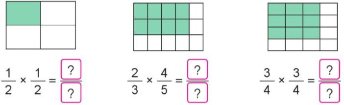 $\frac{1}{2} \times \frac{1}{2} = \frac{1}{4}$    ;       $\frac{2}{3} \times \frac{4}{5} = \frac{8}{{15}}$     ;     $\frac{3}{4} \times \frac{3}{4} = \frac{9}{{16}}$