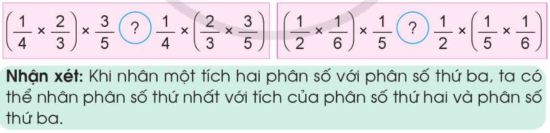 Vậy $\left( {\frac{1}{4} \times \frac{2}{3}} \right) \times \frac{3}{5}$ =  $\frac{1}{4} \times \left( {\frac{2}{3} \times \frac{3}{5}} \right)$
