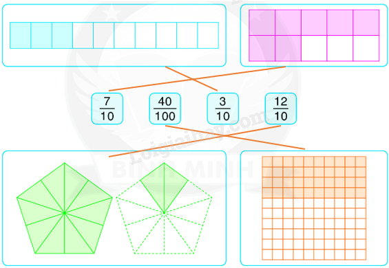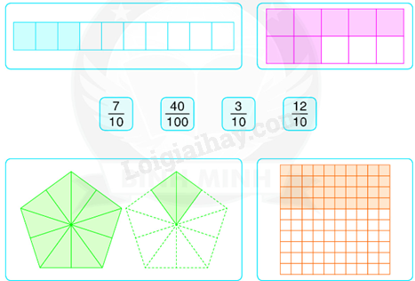 Phân số thập phân chỉ phần đã tô màu ở mỗi hình có tử số là số phần được tô màu, mẫu số là tổng số phần bằng nhau.