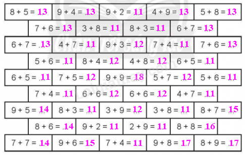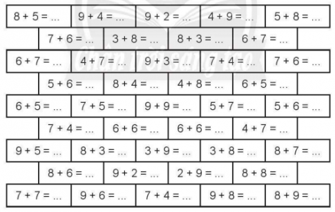 9 + 6 = …..                   7 + 4 = …..                   8 + 3 = …..                   6 + 5 = …..