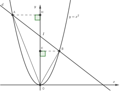 Trong mặt phẳng tọa độ \(Oxy\), cho parabol \(\left( P \right)\) có phương trình \(y = \dfrac{{ – {x^2}}}{2}\). Gọi \(\left( d \right)\) là đường thẳng đi qua \(I\left( {0; – 2} \right)\) và có hệ số góc \(k\). Đường thẳng $(d)$ cắt parabol $(P)$ tại hai điểm phân biệt $A, B.$ Gọi \(H,K\) theo thứ tự là hình chiếu vuông góc của \(A,B\) trên trục hoành. Khi đó tam giác \(IHK\)  là tam giác