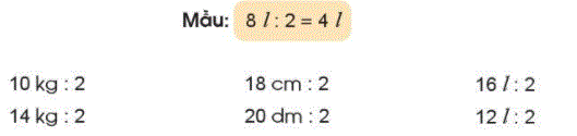 14 kg : 2 = 7 kg                                 20 dm : 2 = 10 cm                12 l : 2 = 6 l