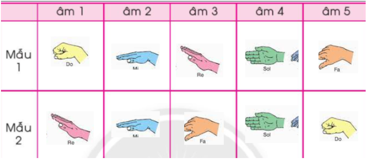 Em hãy chọn hình dán ký hiệu nốt nhạc bàn tay Đô, Rê, Mi, Pha, Son dán vào ô trống thích hợp để  tạo ra 2 mẫu 5 âm và thể hiện