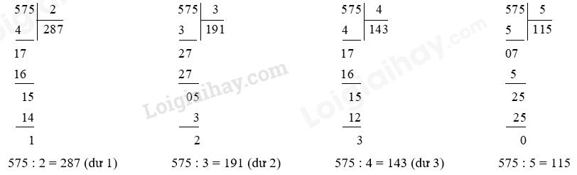 Ví dụ: Chọn số bị chia là 575, số chia có thể là các số 2; 3; 4 hoặc 5.