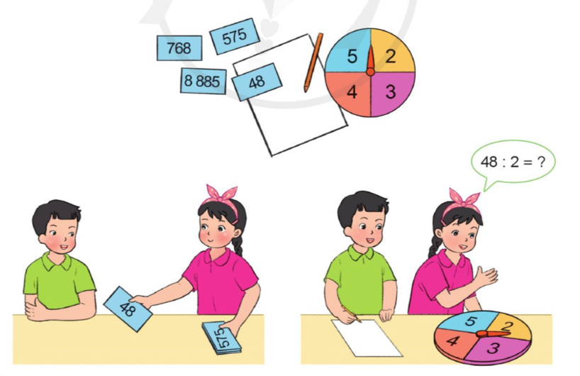 Lấy một thẻ số và chọn số ghi trên thẻ làm số bị chia, quay kim trên hình tròn để chọn số chia. Thực hiện phép chia rồi nêu kết quả.