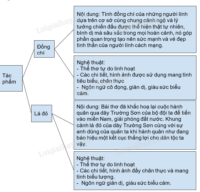Vẽ sơ đồ tư duy trình bày đặc điểm nội dung và nghệ thuật của hai bài thơ Đồng chí và Lá đỏ.