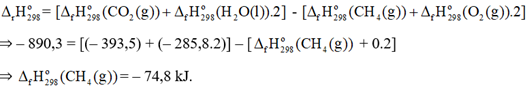 Biết nhiệt tạo thành chuẩn của CO2(g) và H2O(l) tương ứng là – 393,5 và – 285,8 kJ/mol. Nhiệt tạo thành chuẩn của khí methane là
