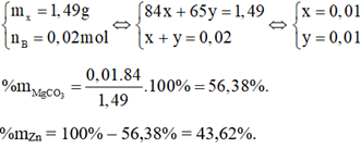 Cho 1,49 gam hỗn hợp X gồm: MgCO3 và Zn vào một lượng vừa đủ dung dịch HCl. Sau phản ứng thu được dung dịch A và 0,4958 lít khí B ở đkc. Xác định % khối lượng của các chất trong X.