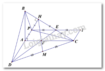 Câu 4: Cho \(\Delta ABC\) vuông tại A, đường cao AH. Trên tia đối của tia AH lấy điểm \(D\) sao cho \(AD = AH.\) Gọi \(E\) và \(M\) lần lượt là trung điểm của HCvà DC, gọi \(F\) là giao điểm của DE và AC.