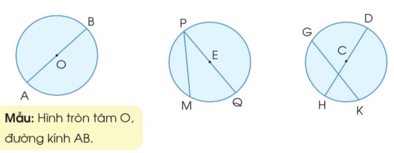 b) Gọi tên hình tròn và đường kính của mỗi hình sau (theo mẫu):