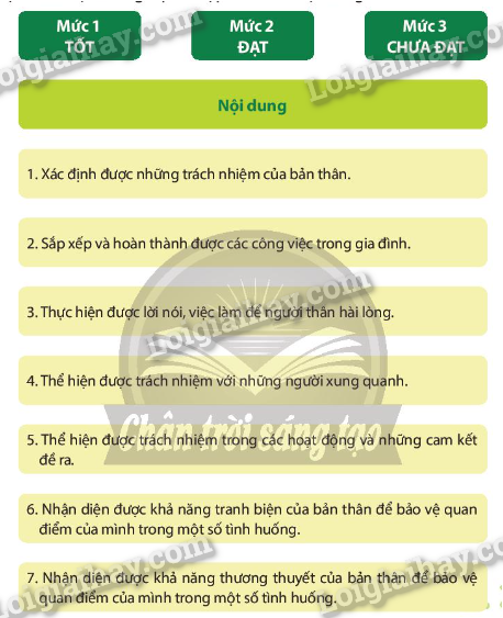 Lựa chọn mức độ đánh giá phù hợp cho mỗi nội dung.
