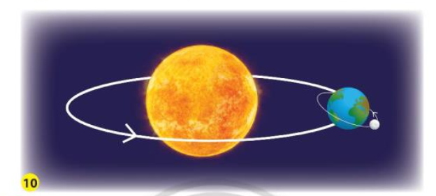 Chỉ trên hình vị trí Mặt Trời, Trái Đất, Mặt Trăng và nói về chiều chuyển động của Trái Đất quanh Mặt Trời và Mặt Trăng quanh Trái Đất.