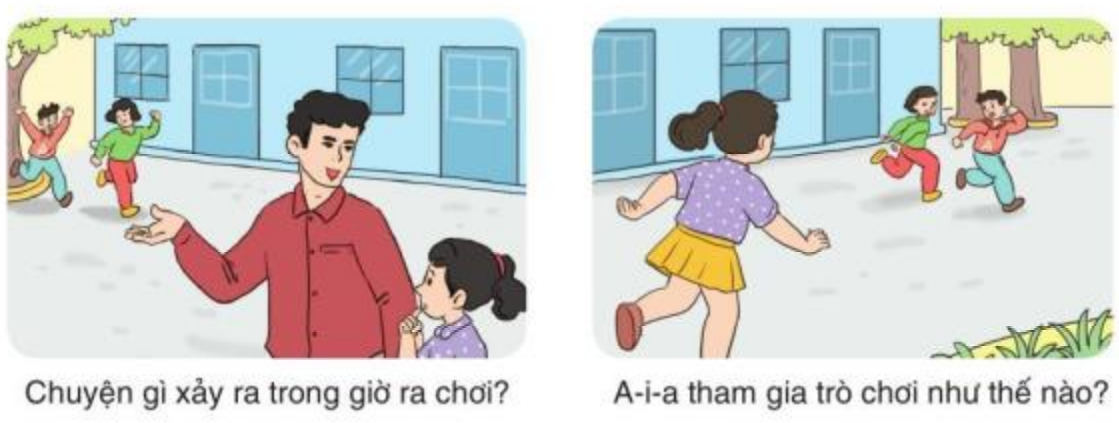 – Tranh 1: Trong giờ ra chơi, do A-i-a là học sinh mới, chưa quen biết các bạn nên con rụt rè, ngồi một mình. Thấy vậy, thầy giáo liền khích lệ A-i-a, giúp cho A-i-a có dũng khi và tham ra chơi cùng các bạn.