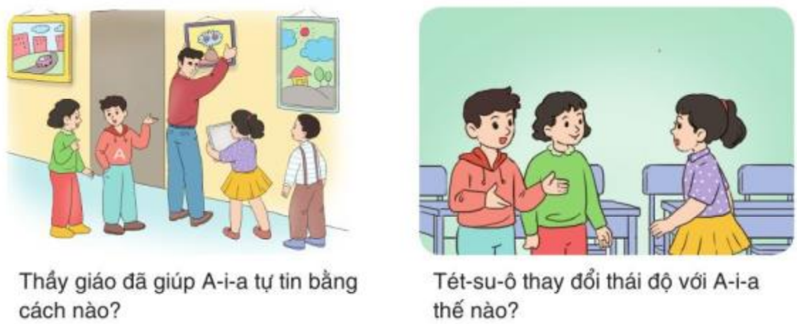 – Tranh 3: Thầy giáo đã giúp A-i-a tự tin hơn bằng cách hỏi về các bức tranh mà A-i-a vẽ, tro các bức tranh ở hành lang để mọi người có thể ngắm nhìn nó, khiên mọi người hiểu và biết nhiều hơn về A-i-a.