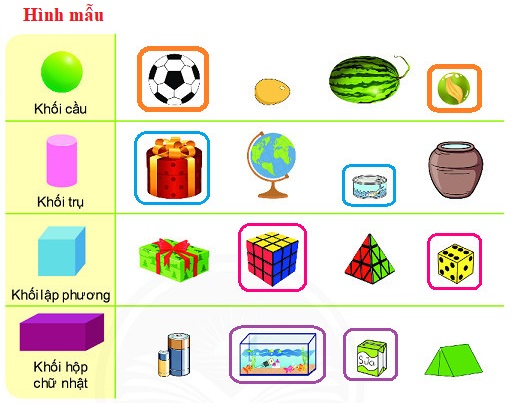 Xem lại hình dạng của khối trụ, khối cầu, khối hộp chữ nhật rồi kể tên các đồ vật có dạng khối trụ, khối cầu, khối hộp chữ nhật.
